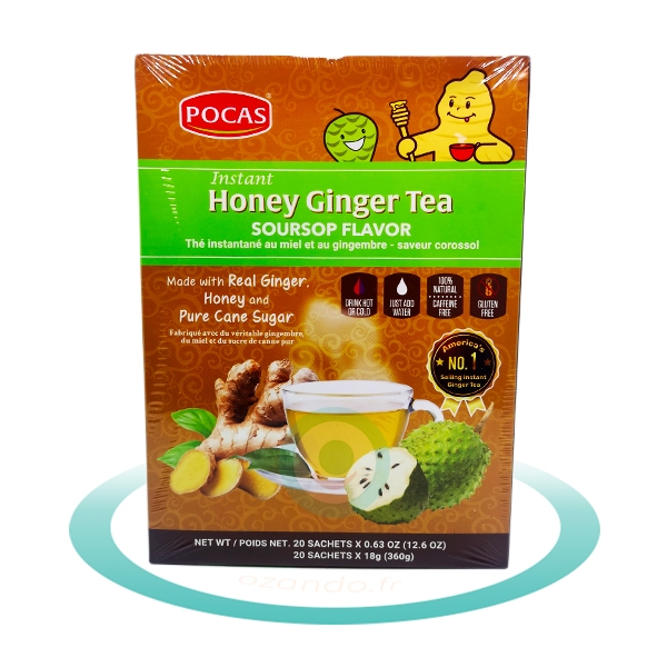 Thé instantané au miel et au gingembre, saveur : citron, curcuma, original, corossol. 20 sachets x 18g